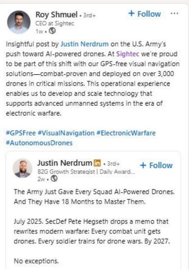 “Insightful post by Justin Nerdrum on the U.S. Army’s push toward AI-powered drones. At Sightec we’re proud to be part of this shift with our GPS-free visual navigation solutions—combat-proven and deployed on over 3,000 drones in critical missions.”