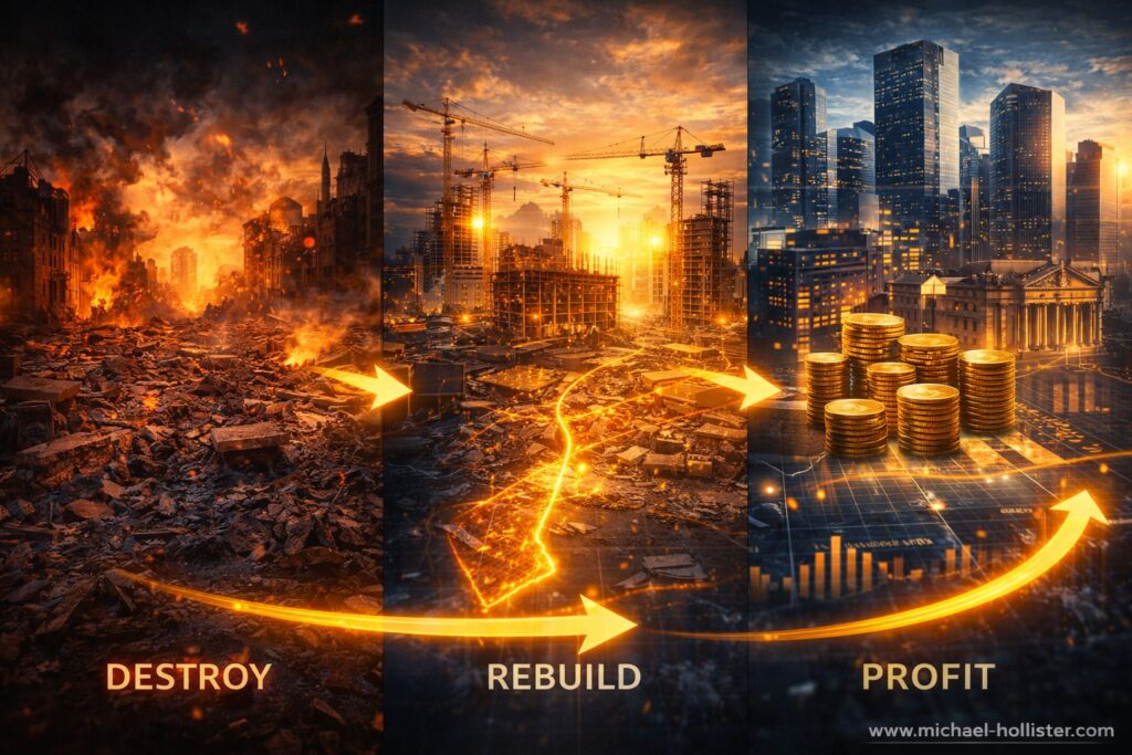 Step 1: Destruction – Israel bombs Gaza for 26 months. With U.S. weapons. With U.S. support. 80,000 dead. 86-90% destruction.