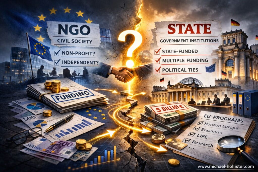 Summary: The European Court of Auditors documented in April 2025: 12,000 NGOs received EU funds, 40 percent of which flowed to just 30 organizations. Their names were redacted in the report and not disclosed by the Commission upon parliamentary inquiry. An independent evaluation of the EU financial database identifies these 30 organizations. Among them are state-controlled federal institutes fulfilling governmental functions—and these same organizations finance themselves not only from the NGO pot but simultaneously from up to 16 additional EU programs.
