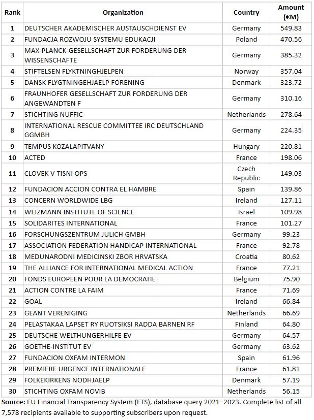 The Top 30 NGO Recipients of the EU 2021–2023 (Direct Funds in Million Euros)