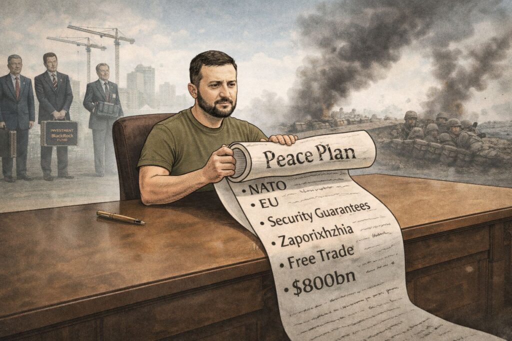 Stattdessen geht es um EU-Beitritt, LNG-Geschäfte mit den USA, Kinder-Rückführungen, ein Freihandelsabkommen, eine amerikanische Hauptverwaltung über ein russisch besetztes Kernkraftwerk – und ein Fondsmanagement zur Reindustrialisierung der Ukraine, dessen Struktur mehr an BlackRock erinnert als an die UNO.
