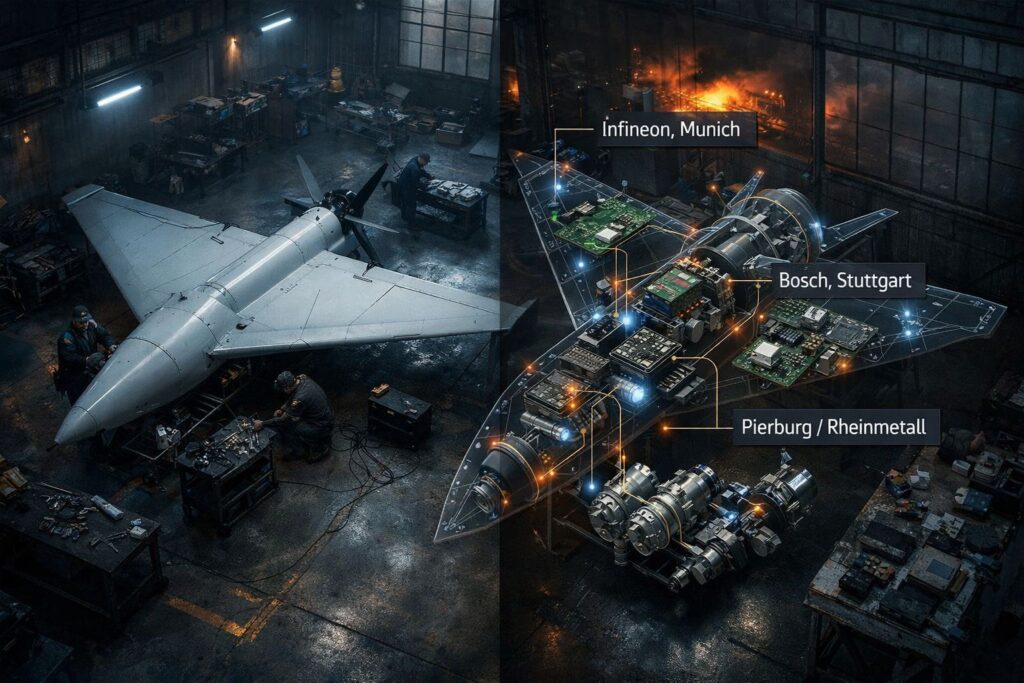 Jahrzehnte später tauchte dieselbe Konstruktionslogik im iranischen Shahed auf – wie, das ist bis heute nicht vollständig rekonstruiert. Und jetzt, 2026, fliegt sie als russische Massenwaffe über ukrainische Kraftwerke, gebaut nach demselben Grundprinzip, das in Westdeutschland erdacht wurde, mit Elektronik von deutschen Herstellern.